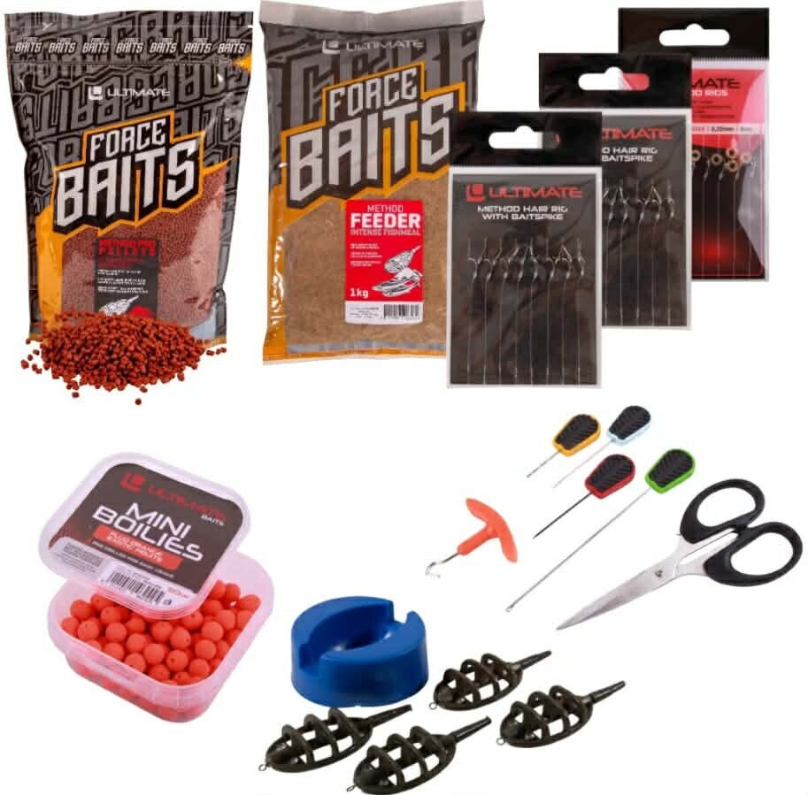 De set is als volgt samengesteld: - 1x Ultimate Method Feeder + Flexi Mould Set - 1x Ultimate Baiting Tool Set - 2x Ultimate Method Hair Rig with Baitspike (8 stuks) - 1x Ultimate Method Hair Rig Baitband (8 stuks) - 1x Ultimate Method Pro Pellets 2mm Strawberry & Robin Red 700g - 1x Ultimate Method Feeder Intense Fishmeal 1 kg - 1x Ultimate Baits Pre Drilled – Mini Boilies Fluo Orange Exotic Fruits 9mm Omschrijving Dit Ultimate Method Feeder Starter Pack is speciaal samengesteld voor de beginnende Method Feeder visser maar is gewoon perfect voor iedereen die wil vissen op witvis en kleine karpers met deze succesvolle vistechniek. Met behulp van de Moulding Cap breng je snel en gemakkelijk de juiste hoeveelheid grondvoer aan op een van de twee voerkorven. De Method korven houden het voer goed vast en werpen zeer precies. Bij de set zijn twee zakken voer van verschillende smaak inbegrepen, boordevol aantrekkelijke ingrediënten en met een hoge kleefkracht. Je kunt allerlei harde of zachte aassoorten monteren met behulp van de kant-en-klare rigs. Meegeleverd is een box met Mini Boilies en met behulp van de set Baiting Tools kun je het aas perfect monteren. Kortom, een perfecte Method Feeder set die veel waar biedt voor het geld! Specificaties: Ultimate 4+1 Method Feeder Set - Compleet setje - Inline Method Feeder - Zeer leuk en effectief - Vangt (bijna) altijd - Geschikt voor grote voorn, brasem, zeelt, kleine karper! Ultimate Baiting Tool Set - Alles in één pakket - Standaard, extra long en extra strong boilienaald - Inclusief schaartje en knot-puller Ultimate Method Hair Rig with Baitspike - Kant-en-klare rig - Haakmaat: 8 - Diameter: 0,22mm - Lengte: 8cm - Aantal: 8 stuks Ultimate Baits Pre-drilled Mini Boilies - Voorgeboorde mini boilies - Diameter: 9mm - Inhoud: 50g - Fluoriserend - Verkrijgbaar in meerdere kleur/smaak combinaties - Felle en opvallende kleuren - Zeer stevige structuur - Enorme aantrekkingskracht - Makkelijk in gebruik - Verpakt in handig hersluitbaar bakje Ultimate Force Baits Method Feeder Lokvoer - Inhoud: 1kg - Hoge kleefkracht - Attractieve samenstelling - Uitstekend in combinatie met een method feeder - Combineerbaar met pellets, additieven of flavours - Geschikt voor vijvers, kanalen, rivieren of commercials - Perfect voor de serieuze en beginnende wit- en/of karpervisser Ultimate Method Pro Pellets - Inhoud: 700g - Diameter: 2mm - Kleeft goed - Hersluitbare verpakking - Attractieve samenstelling - Geschikt voor vijvers, kanalen, rivieren of commercials - Ideaal voor het feedervissen op karper en andere grote witvis